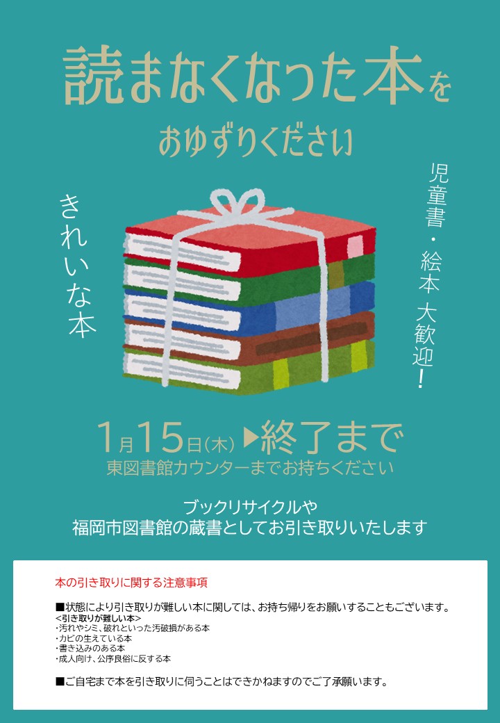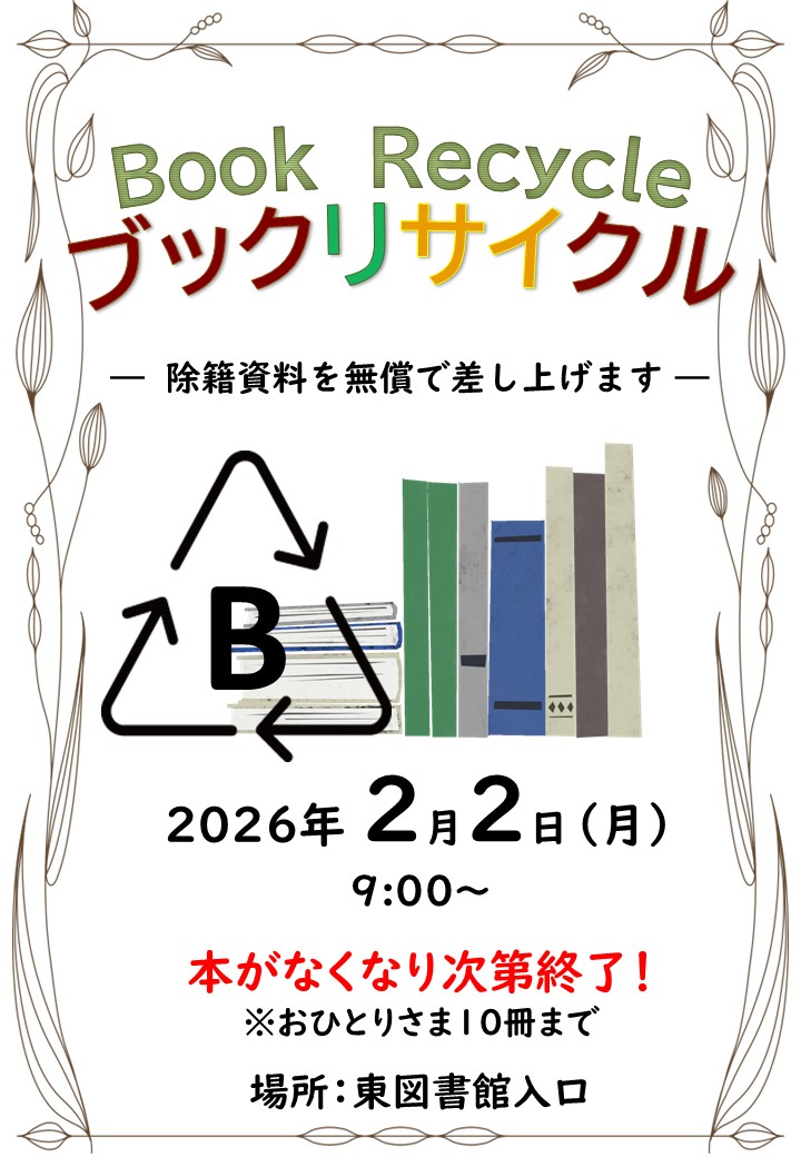 お知らせ 2026年01月07日一般・児童特集 1・2月 2025年12月23日「起業・経営相談会」のおしらせ 1月~3月 2025年12月23日おはなし会1月のおしらせ 開館カレンダー 2026年 1月日月火水木金土2829303112345678910111213141516171819202122232425262728293031 開館休館日開館時間 9:00〜20:00 花と緑あふれる空間で、ゆったり読書を愉しんでみませんか。 わたしたちのめざすもの、それは人と本の出会いの架け橋となること。なにか みつかる きっかけの森 東図書館でいろんな自分に出会ってみませんか。 お知らせ イベント 館内案内 貸出・返却 各種サービス 交通アクセス PICKUP! ブックリサイクル ブックリサイクルを開催します 2026年2月2日(月) 9:00~ 本がなくなり次第終了 ブックリサイクル 読まなくなった本をおゆずりください 2026年1月15日 (木) 9:00~ ブックリサイクル終了まで 朗読とギターで奏でる物語~名作文学を、味わう。~ 2026年2月11日(水・祝) 読書会 まさの図書館 出張読書会 2026年2月14日 (土) 申込開始:2025年12月20日(土)9… 五感に触れるワークショップ 五感に触れるワークショップ アロマオイルのある暮らし~冬編~ 2026年2月3日(火) 申込:12/25(木)9:00~ カウン… 読書会 読書会 なみきブックカフェ 2026年1月25日 (日) 申込開始:2025年12月18日(木)9… ツキイチフラワーレッスン ツキイチフラワーレッスン1月 2026年1月30日(金) 受付開始:1月6日(火)9:00~ 東図… 季節の工作ひろば 【終了しました】子ども向け 季節の工作ひろば 2025年12月20日(土) 申込開始:2025年12月2日(火)9:… ツキイチフラワーレッスン 【終了しました】ツキイチフラワーレッスン12月 2025年12月24日(水) 受付開始:12月1日(月)9:00~ 東… おはなし会 【終了しました】クリスマスおはなし会 2025年12月14日(日) 申込開始:2025年11月17日(月)9…