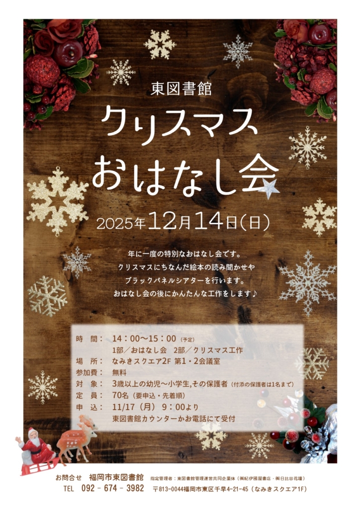 11/17(月)9:00より東図書館カウンターかお電話にて受付
