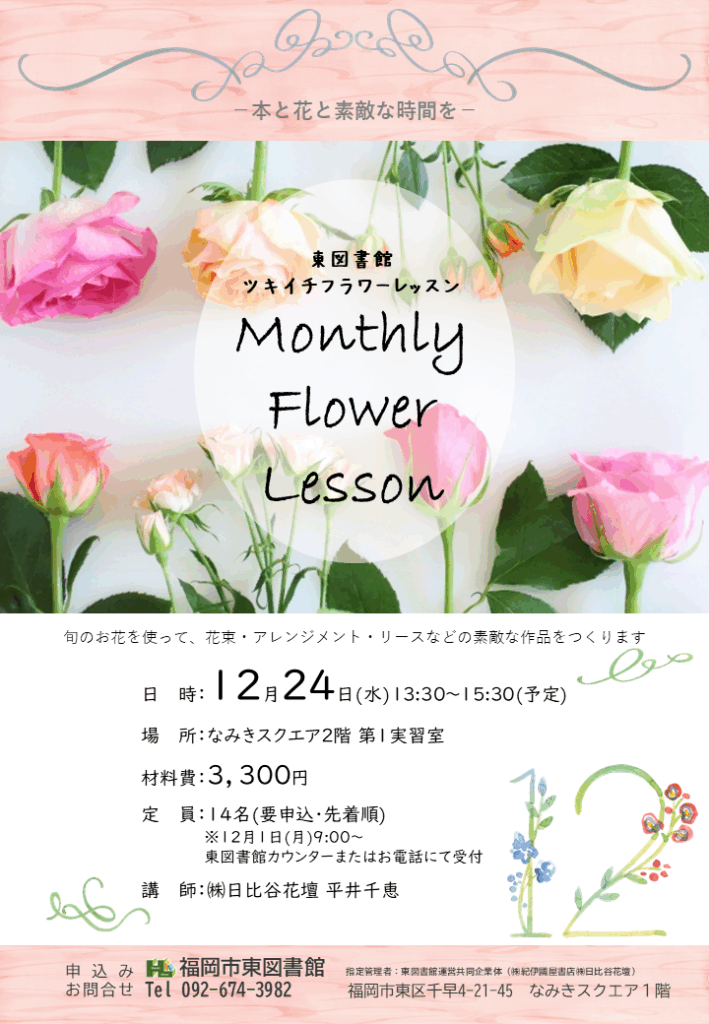 ホーム イベント ツキイチフラワーレッスン12月 ツキイチフラワーレッスン ツキイチフラワーレッスン12月 2025年12月24日(水) 受付開始:12月1日(月)9:00~ 東図書館カウンターまたはお電話にて イベント概要 タイトル ツキイチフラワーレッスン12月 開催日 2025年12月24日(水) 開催時間 13:30~15:30(予定) 開催場所 なみきスクエア2階 第1実習室 入場料 材料費:3,300円 定員 14名(要申込・先着順) お知らせ 旬のお花を使って、花束・アレンジメント・リースなどの素敵な作品をつくります。 シェア ツイート LINEで送る 前へ イベント一覧へ