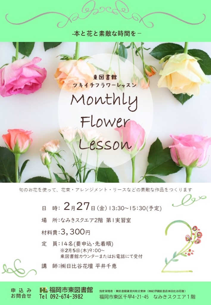 ホーム イベント ツキイチフラワーレッスン2月 ツキイチフラワーレッスン ツキイチフラワーレッスン2月 2026年2月27日(金) 申込開始:2026年2月5日(木) 9:00~ 東図書館カウンターまたはお電話にて受付 イベント概要 タイトル ツキイチフラワーレッスン2月 開催日 2026年2月27日(金) 開催時間 13:30~15:30(予定) 開催場所 なみきスクエア2階 第1実習室 入場料 3,300円 定員 14名(要申込・先着順) お知らせ 旬のお花を使って、花束・アレンジメント、リースなどの素敵な作品をつくります。 シェア ツイート LINEで送る 前へ イベント一覧へ