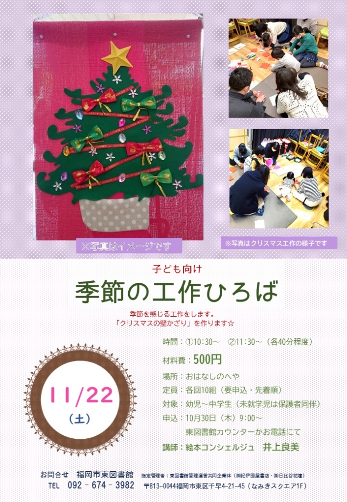 ホーム イベント 子ども向け 季節の工作ひろば 季節の工作ひろば 子ども向け 季節の工作ひろば 2025年11月22日(土) 申込開始:2025年10月30日(木)9:00~カウンターまたはお電話で受付 イベント概要 タイトル 子ども向け 季節の工作ひろば 開催日 2025年11月22日(土) 開催時間 ①10:30~ ②11:30~ 各回40分程度 開催場所 東図書館おはなしのへや 入場料 材料費:500円 定員 ①②各回10名(先着・要申込) お知らせ 季節を感じる工作をします。 「クリスマスの壁かざり」を作ります☆ シェア ツイート LINEで送る 前へ イベント一覧へ 次へ
