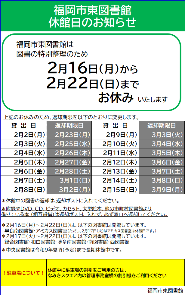 2/16(月)~2/22(日)は図書特別整理のため休館いたします。