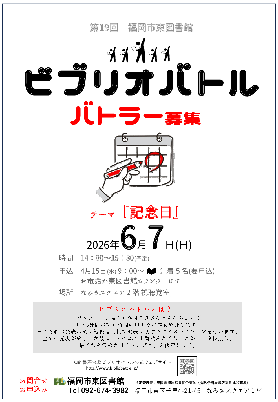 お知らせ 2026年03月24日おはなし会 4月のお知らせ 2026年03月24日「起業・経営相談会」のおしらせ 4月~6月 2026年03月01日一般・児童特集 3・4月 開館カレンダー 2026年 4月日月火水木金土29303112345678910111213141516171819202122232425262728293012 開館休館日開館時間 9:00〜20:00 花と緑あふれる空間で、ゆったり読書を愉しんでみませんか。 わたしたちのめざすもの、それは人と本の出会いの架け橋となること。なにか みつかる きっかけの森 東図書館でいろんな自分に出会ってみませんか。 お知らせ イベント 館内案内 貸出・返却 各種サービス 交通アクセス PICKUP! 第19回 ビブリオバトル 開催 2026年6月7日(日) バトラー受付開始:4月15日(水)9:0… ガクリバ 2026年4月~ 基本的に第2・4金曜日 申し込み不要 楽しんだり、学べる、中高生… ディンプルアート4月 2026年4月19日(日) 申込開始:2026年4月1日(水) 9:… おはなしを語る会「銀のすず」による耳で楽しむおはなしの世界 2026年4月26日(日) 申込開始:2026年4月1日(水) 9:… かんたん味噌仕込みワークショップ 2026年4月15日(水) 混ぜるだけの簡単な味噌づくりです! 失敗… フラワーレッスン ツキイチフラワーレッスン4月 2026年4月24日(金) 申込開始:2026年4月2日(木) 9:… 絵手紙風に春を描こう アートメッセージ 2026年4月14日(火) はがきに筆で絵やメッセージを描く講座です… 数字で知る私の本質 お茶で整える心と体 2026年4月12日(日) 心と体で感じる時間を過ごしましょう 小中高校生向けイベント 【終了しました】グリーティングカードを作って贈ろう! 2026年3月22日(日) 申込開始:2026年3月12日(木)9:… 【終了しました】クリエイトラボ 2026年3月22日(日) ボードゲームや折り紙を準備しています☆ …