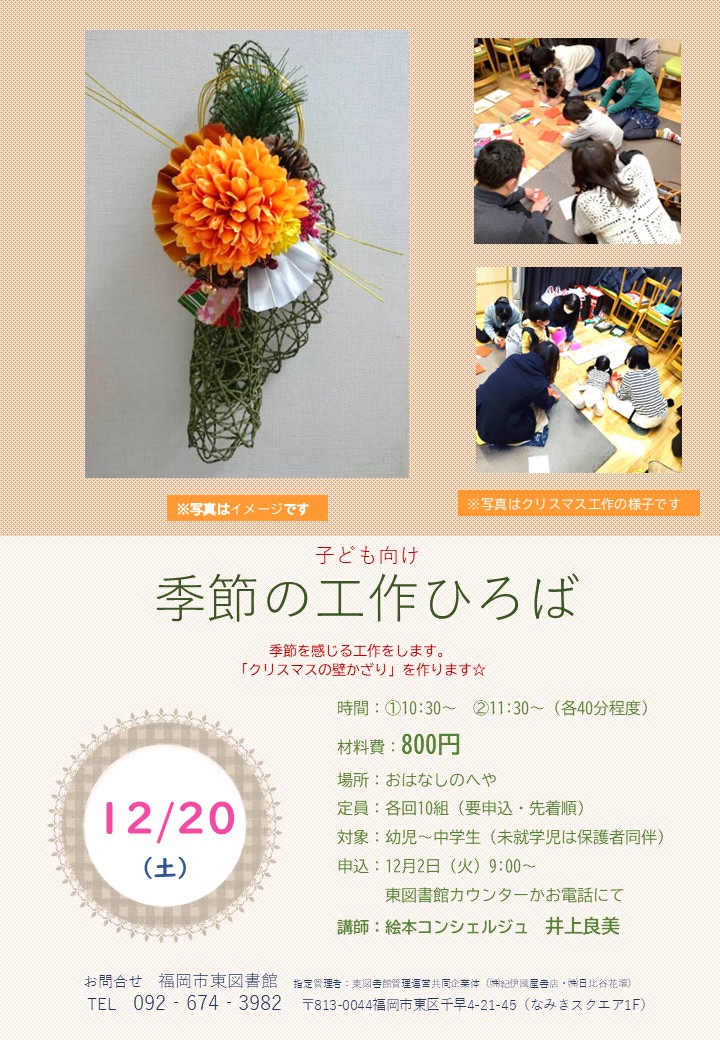 お知らせ 2025年10月30日おはなし会11月のおしらせ 2025年10月08日図書館だより《みなすくレター9・10月号》 2025年10月01日起業経営相談会10月~12月のおしらせ 開館カレンダー 2025年 12月日月火水木金土3012345678910111213141516171819202122232425262728293031123 開館休館日開館時間 9:00〜20:00 花と緑あふれる空間で、ゆったり読書を愉しんでみませんか。 わたしたちのめざすもの、それは人と本の出会いの架け橋となること。なにか みつかる きっかけの森 東図書館でいろんな自分に出会ってみませんか。 お知らせ イベント 館内案内 貸出・返却 各種サービス 交通アクセス PICKUP! 季節の工作ひろば 子ども向け 季節の工作ひろば 2025年12月20日(土) 申込開始:2025年12月2日(火)9:… ツキイチフラワーレッスン ツキイチフラワーレッスン12月 2025年12月24日(水) 受付開始:12月1日(月)9:00~ 東… おはなし会 クリスマスおはなし会 2025年12月14日(日) 申込開始:2025年11月17日(月)9… 絵手紙風のアートメッセージにチャレンジしませんか 2025年12月16日(火) 申込開始:2025年11月14日(金)9… ディンプルアートクリスマス講座 2025年12月13日(土) フラワーポケット一輪挿し 申込開始:20… 読書会 【終了しました】夜の読書会 なみきブックカフェ 2025年11月27日(木) 申込開始:2025年11月3日(月・祝)… 季節の工作ひろば 【終了しました】子ども向け 季節の工作ひろば 2025年11月22日(土) 申込開始:2025年10月30日(木)9… ツキイチフラワーレッスン 【終了しました】ツキイフラワーレッスン 11月 2025年11月28日(金) 申込開始:2025年10月31日(金) … 語り 【終了しました】ようこそ昔話の世界へ おはなしあれこれ 2025年11月24日(月・祝) 申込開始:10月15日(水)9:00~東… 創業セミナー 創業セミナー ①9/6 ②10/4 ③11/1 ④12/6 受付開始:8/4(月)~お電話かFAX、…