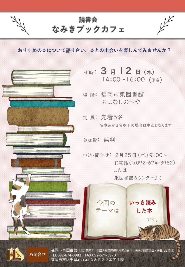 2/16(月)~2/22(日)は図書特別整理のため休館いたします。 お知らせ 2026年02月07日図書館だより《みなすくレター1・2月号》 2026年01月31日おはなし会2月・3月のおしらせ 2026年01月07日一般・児童特集 1・2月 開館カレンダー 2026年 2月日月火水木金土12345678910111213141516171819202122232425262728 開館休館日開館時間 9:00〜20:00 花と緑あふれる空間で、ゆったり読書を愉しんでみませんか。 わたしたちのめざすもの、それは人と本の出会いの架け橋となること。なにか みつかる きっかけの森 東図書館でいろんな自分に出会ってみませんか。 お知らせ イベント 館内案内 貸出・返却 各種サービス 交通アクセス PICKUP! 読書会 読書会 なみきブックカフェ 2026年3月12日 (木) 申込開始:2026年2月25日(水)9:… ツキイチフラワーレッスン ツキイチフラワーレッスン3月 2026年3月29日(日) 申込開始:2026年3月2日(月) 9:… ディンプルアート 自由デザイン講座 2026年3月26日(木) 申込受付:2026年3月1日~20日 東… ミモザのリース作りワークショップ 2026年3月7日(土) 受付開始:2026年2月23日(月)9:… ぬいぐるみおとまり会 2026年3月14日(土) 受付開始:2026年2月27日(金)9:… 【終了しました】英語リーディングアドベンチャーがはじまるよ 2026年2月7日(土) 英語の楽しい読み聞かせで子どもたちが英語… ツキイチフラワーレッスン ツキイチフラワーレッスン2月 2026年2月27日(金) 申込開始:2026年2月5日(木) 9:… ブックリサイクル 【終了しました】ブックリサイクルを開催します 2026年2月2日(月) 9:00~ 本がなくなり次第終了 ブックリサイクル 【終了しました】読まなくなった本をおゆずりください 2026年1月15日 (木) 9:00~ ブックリサイクル終了まで 【終了しました】朗読とギターで奏でる物語~名作文学を、味わう。~ 2026年2月11日(水・祝)