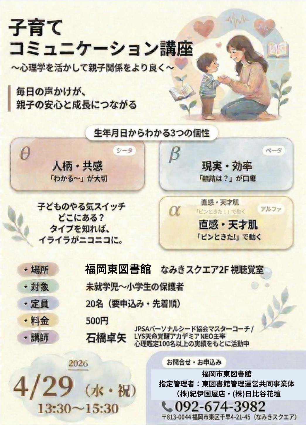 お知らせ 2026年03月24日おはなし会 4月のお知らせ 2026年03月24日「起業・経営相談会」のおしらせ 4月~6月 2026年03月01日一般・児童特集 3・4月 開館カレンダー 2026年 4月日月火水木金土29303112345678910111213141516171819202122232425262728293012 開館休館日開館時間 9:00〜20:00 花と緑あふれる空間で、ゆったり読書を愉しんでみませんか。 わたしたちのめざすもの、それは人と本の出会いの架け橋となること。なにか みつかる きっかけの森 東図書館でいろんな自分に出会ってみませんか。 お知らせ イベント 館内案内 貸出・返却 各種サービス 交通アクセス PICKUP! 子育てコミュニケーション講座~心理学を活かして親子関係をより良く~ 2026年4月29日(水・祝) 毎日の声かけが、親子の安心と成長につなが… 第19回 ビブリオバトル 開催 2026年6月7日(日) バトラー受付開始:4月15日(水)9:0… ガクリバ 2026年4月~ 基本的に第2・4金曜日 申し込み不要 楽しんだり、学べる、中高生… ディンプルアート4月 2026年4月19日(日) 申込開始:2026年4月1日(水) 9:… おはなしを語る会「銀のすず」による耳で楽しむおはなしの世界 2026年4月26日(日) 申込開始:2026年4月1日(水) 9:… かんたん味噌仕込みワークショップ 2026年4月15日(水) 混ぜるだけの簡単な味噌づくりです! 失敗… フラワーレッスン ツキイチフラワーレッスン4月 2026年4月24日(金) 申込開始:2026年4月2日(木) 9:… 絵手紙風に春を描こう アートメッセージ 2026年4月14日(火) はがきに筆で絵やメッセージを描く講座です… 数字で知る私の本質 お茶で整える心と体 2026年4月12日(日) 心と体で感じる時間を過ごしましょう 小中高校生向けイベント 【終了しました】グリーティングカードを作って贈ろう! 2026年3月22日(日) 申込開始:2026年3月12日(木)9:…