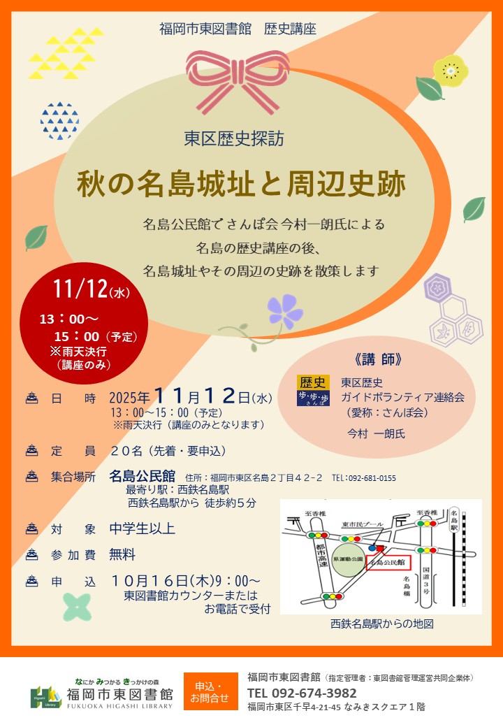 ホーム イベント 福岡市東図書館で催される様々なイベントをご紹介します。 東区歴史探訪 秋の名島城址と周辺史跡 2025年11月12日(水) 申込開始:2025年10月16日(木)9… 甘酒講座 2025年11月19日(水) 申込開始:10月20日(月)9:00~東… 中国茶の文化と歴史 2025年11月13日(木) 申込開始:10月17日(金)9:00~東… 語り ようこそ昔話の世界へ おはなしあれこれ 2025年11月24日(月・祝) 申込開始:10月15日(水)9:00~東… ハングル講座 中級向けハングル講座 韓国語で詩を読む 2025年11月2日(日) 申込開始:10月1日(水)9:00~東図… 季節の工作ひろば こども向け 季節の工作ひろば 2025年10月25日(土) 申込開始:2025年10月3日(金)9:… 健康講座 生き活き講座 食べて元気にフレイル予防~栄養&ストレッチ~ 2025年10月31日(金) 受付開始 10月6日(月)9:00~ 福… 五感に触れる植物ワークショップ アロマオイルのある暮らし 2025年10月29日(水) 申込開始:2025年9月25日(木)9:… 第18回 ビブリオバトル 開催 2025年10月26日(日) バトラー受付開始:9月1日(月) 9:0… 創業セミナー 創業セミナー ①9/6 ②10/4 ③11/1 ④12/6 受付開始:8/4(月)~お電話かFAX、…