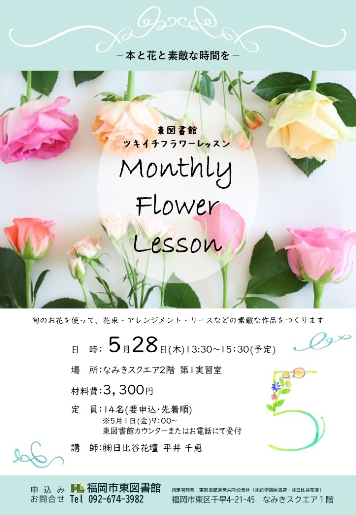 ホーム イベント ツキイチフラワーレッスン5月 ツキイチフラワーレッスン5月 2026年5月28日(木) 5月1日(金)9:00より東図書館カウンターもしくはお電話にて受付 イベント概要 タイトル ツキイチフラワーレッスン5月 開催日 2026年5月28日(木) 開催時間 午後1時30分~午後3時30分 開催場所 なみきスクエア 2階 第1実習室 入場料 3,300円(材料費として) 定員 先着14名 ※5月1日(金)9:00より東図書館カウンターもしくはお電話にて受付 お知らせ シェア ツイート LINEで送る 前へ イベント一覧へ