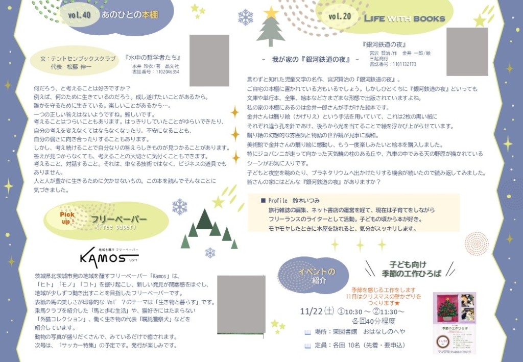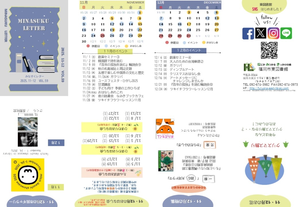 ホーム お知らせ 図書館だより《みなすくレター11・12月号》 図書館だより《みなすくレター11・12月号》 2025年12月02日 福岡市東図書館だより《みなすくレター2025年11・12月号》が できあがりました。カウンターで配布中です!! (表) (裏) シェア ツイート LINEで送る 前へ お知らせ一覧へ